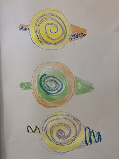 I have come back to the circles again which have appeared in several of my exercises. For both mushrooms and teapots. I would like to explore them further looking at different methods and combining them. As well as using a vibrant colour palette to keep building on my confidence in using colour.